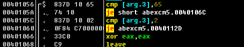 最后就到了我们刚才爆破的地方,cmp相同标志位ZF为1,不同为0(其实是对两个操作数进行相减,但是不对操作数进行改变,只是改变了标志位而已)。最后再用je(即jz)对地址进行跳转