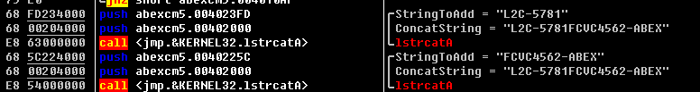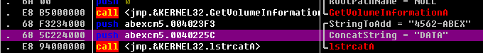 往下继续走,可以看见已经捕获到了本人的磁盘名称,而且把名称和一个字符串4562-ABEX放在一起了(strcat函数不过多介绍,就是把字符拼接在一起)