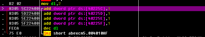 它把我们在栈上的磁盘名称的ascall码按字节进行了加1操作(别看见dword就是双字节,每个相邻指令的地址只变了1),而且循环了两次