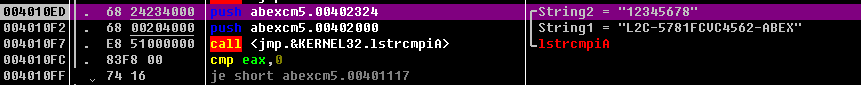 这里程序加载了一个strcmp函数,而且把我们输入的和它生成的一串字符串当作函数参数放进了栈里,这个肯定可以看得出来在比较,比较过后的结果放进eax里面,如果不相同就是0,相同就是1