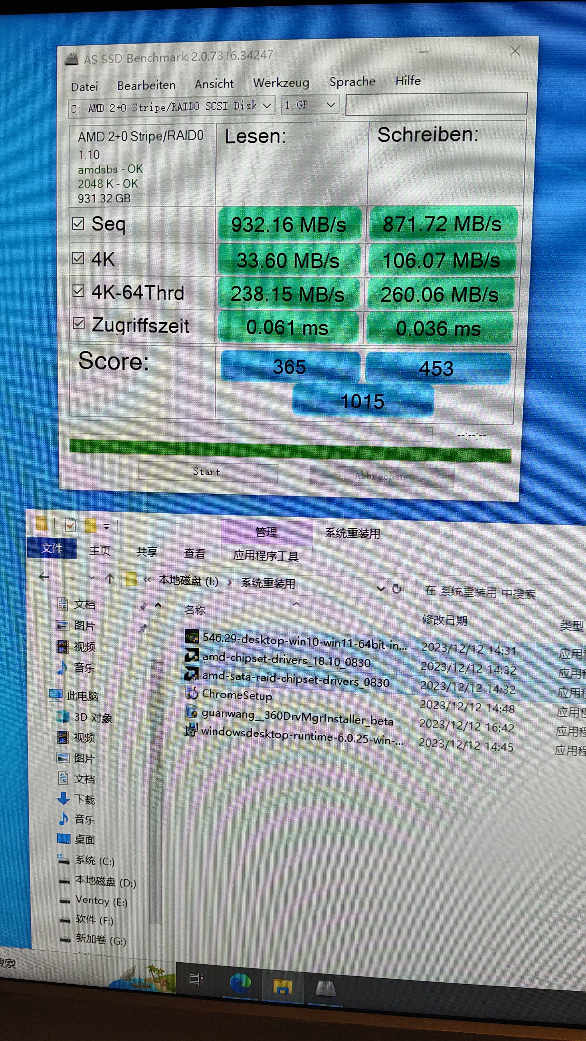 2023.12.23更换了两块全新的固态硬盘,使用了传统启动方式Legacy(mbr),组成了raid0,所有raid 0参数没有任何更改,保持了默认,因为经过多次测试,改变任意raid0参数均会造成无法安装系统,系统安装会出错。组成raid0后,使用dg硬盘工具进行了分区以及4k对齐(选择块大小为4096)。没有使用360驱动安装驱动,自行下载安装了,安装顺序1、amd-chipset-drivers_18.10_0830。2、amd-sata-raid-chipset-drivers_0830。3、546.29-desktop-win10-win11-64bit-international-dch-whql。安装完成后用ASSSDBench检测分数超过历史最高分数,超过1000分,截图记录如下