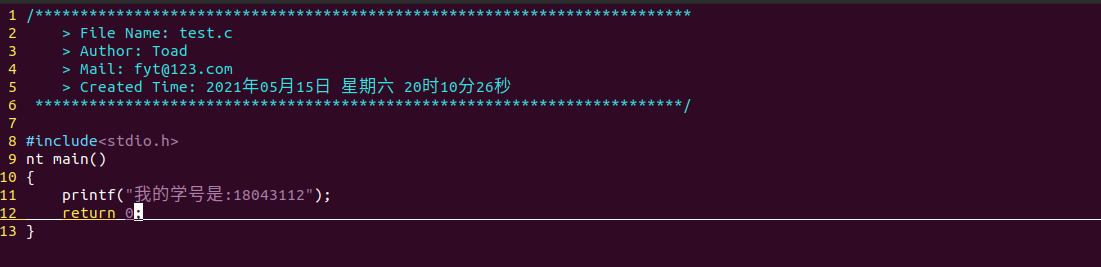 | 通过vim编辑器写一个最简单的C语言程序,如写一个输出自己学号的程序。 |
