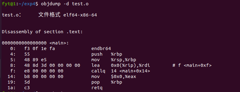 | 这里生成的test.o不是文本文件了,是二进制文件,我们可以通过objdump命令来反汇编该文件来分析文件内容,如下图所示: |