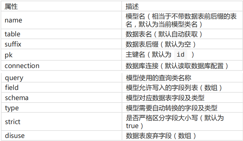 //需要设置 name 属性或者 table 属性。 namespace app\model; use think\Model; class UserModel extends Model { protected $name = 'user'; //模型名称不用带前缀 protected $table = 'bbs_user'; //表名称需要带前缀 }
