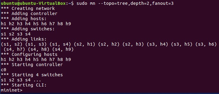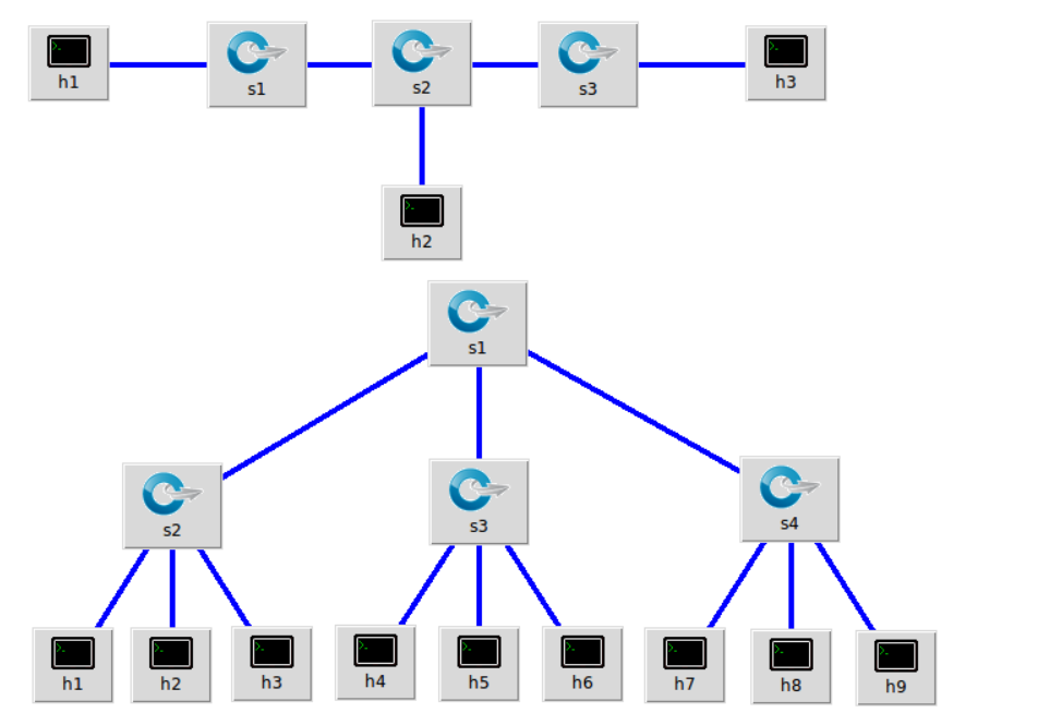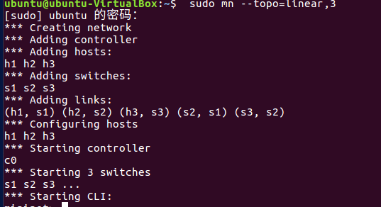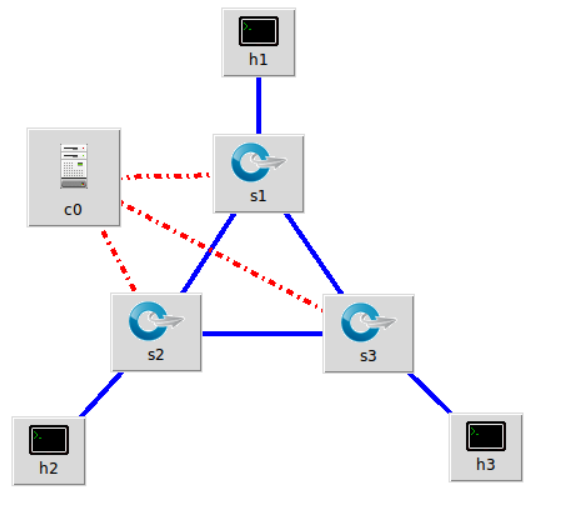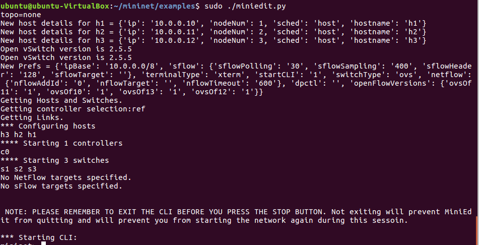 3.利用可视化工具搭建如下拓扑,并要求支持OpenFlow 1.0 1.1 1.2 1.3,设置h1(10.0.0.10)、h2(10.0.0.11)、h3(10.0.0.12),拓扑搭建完成后使用命令验证主机ip,查看拓扑端口连接情况。