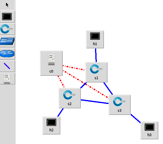 miniedit可视化界面如下,拖出主机及交换机,进行连接