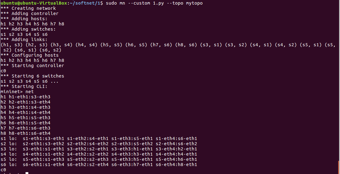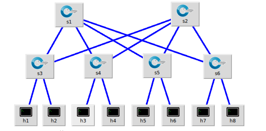 4.利用Python脚本完成如下图所示的一个Fat-tree型的拓扑(交换机和主机名需与图中一致,即s1s6,h1h8,并且链路正确,请给出Mininet相关截图)