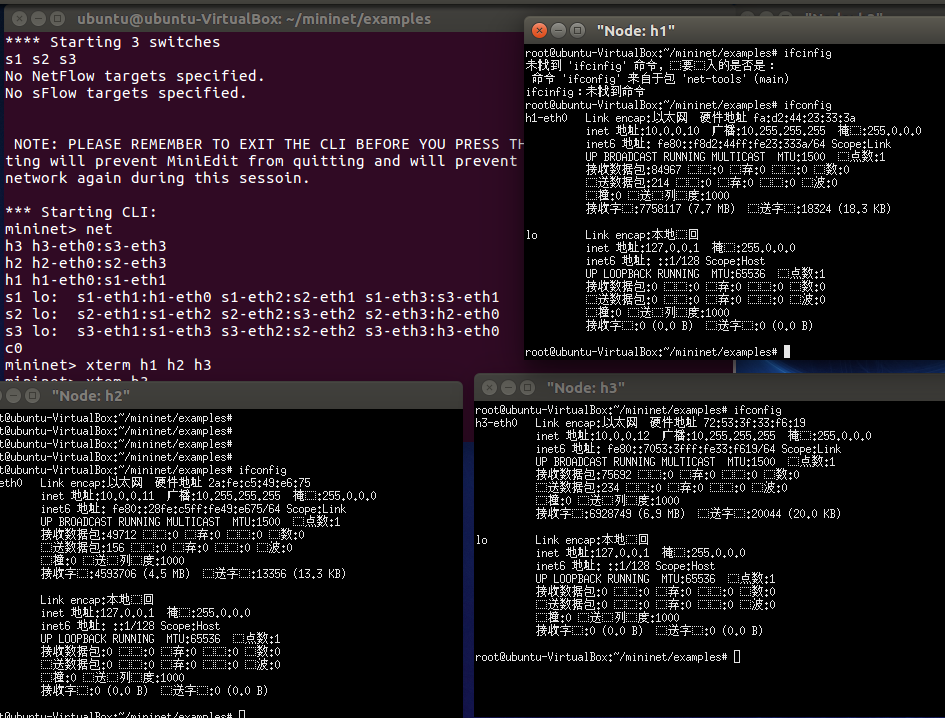 使用xterm命令和ifconfig验证主机ip,查看拓扑端口连接情况