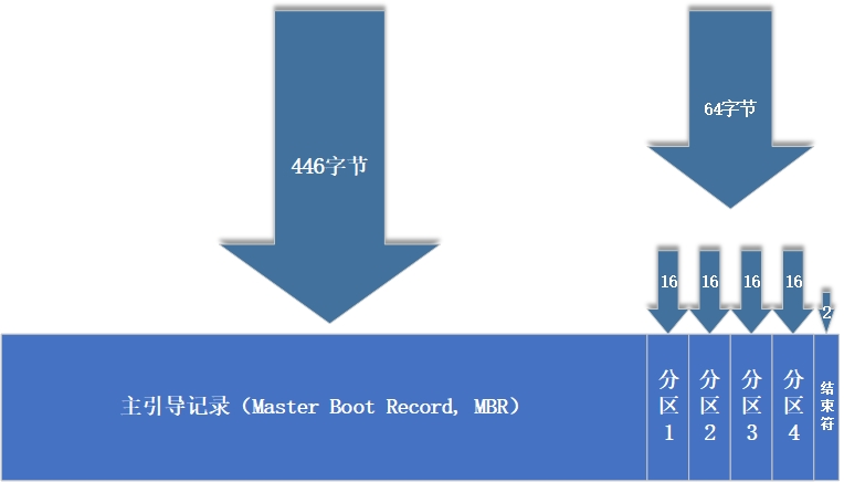 第一个扇区来讲,主引导记录需要占用446字节,分区表为64字节,结束符占用2字节;其中分区表中每记录一个分区信息就需要16字节,这样一来最多只有4个分区信息可以写到第一个扇区中,这4个分区就是4个主分区。第一个扇区中的数据信息如图