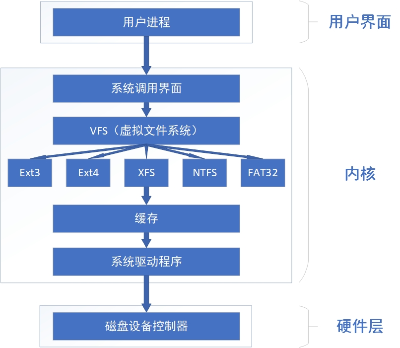 计算机系统在发展过程中产生了众多的文件系统,为了使用户在读取或写入文件时不用关心底层的硬盘结构,Linux内核中的软件层为用户程序提供了一个VFS(Virtual File System,虚拟文件系统)接口,这样用户实际上在操作文件时就是统一对这个虚拟文件系统进行操作了。从中可见,实际文件系统在VFS下隐藏了自己的特性和细节,这样用户在日常使用时会觉得“文件系统都是一样的”,也就可以随意使用各种命令在任何文件系统中进行各种操作了(比如使用cp命令来复制文件)。