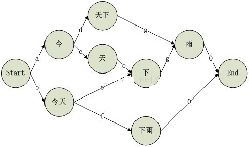 至此,我们已经将问题转化为在图结构中的最短路径问题。图的顶点是句子中出现的词典词语,权值是相对的log(p(w))。