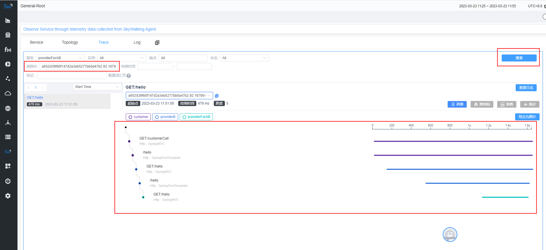 进入Skywalking控制台界面,切换到trace标签页,可以看到请求在整个链路的处理流程,输入tid:a652d39f60f147d2a3eb5277bb0a47b2.92.16795434645000001