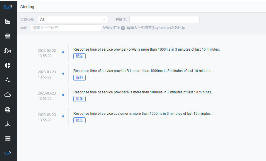 重启Skywalking,在控制台告警页面可以看到告警信息了