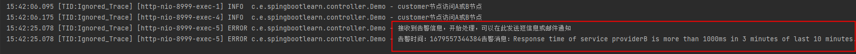 11:51:04.501 [TID:a652d39f60f147d2a3eb5277bb0a47b2.92.16795434645000001] [http-nio-8999-exec-5] INFO c.e.spingbootlearn.controller.Demo - customer节点访问A或B节点 11:51:05.000 [TID:a652d39f60f147d2a3eb5277bb0a47b2.92.16795434645000001] [http-nio-8182-exec-9] INFO c.e.spingbootlearn.controller.Demo - 通过B节点访问业务接口 11:51:06.052 [TID:a652d39f60f147d2a3eb5277bb0a47b2.92.16795434645000001] [http-nio-9900-exec-2] INFO c.e.spingbootlearn.controller.Demo - providerForAB业务接口返回数据