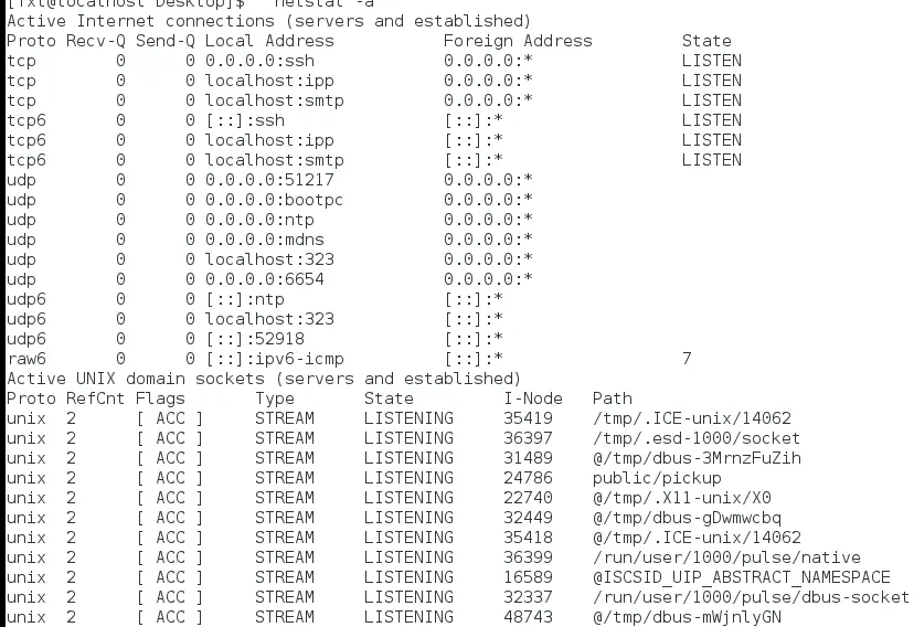 unix 2 [ ACC ] STREAM LISTENING 35419 14062/gnome-session /tmp/.ICE-unix/14062