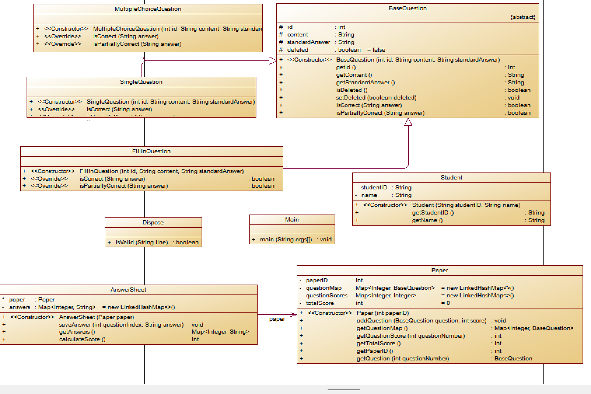 本次程序我利用了正则表达式来对输入合理性进行判断,然后利用继承题目类BaseQuestion类来对多选题以及填空题进行处理,可以轻松地扩展现有的题目类,而不会影响已有的代码。SingleQuestion类、MultipleChoiceQuestion类和FillInQuestion类可以覆盖或重写BaseQuestion父类的方法,以提供特定于子类的行为,这增强了代码的灵活性和可扩展性。层次结构便于利用链表来存储警告信息,在判断完成后再输出,输出采用 TreeMap对学号、试卷号,按从小到大的顺序先按学号排序,再按试卷号排序,对输出结果有了更好的输出。