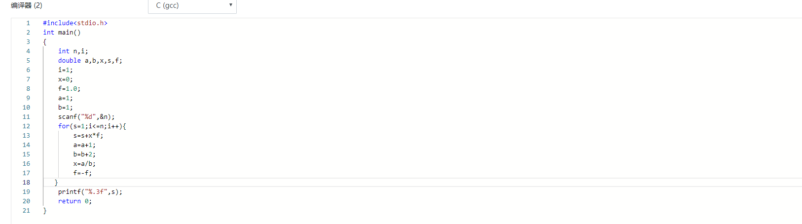我定义了两个整形变脸n,i,五个双精度浮点型变量a,b,x,s,f. a,b,x,s,i是通过直接赋值.s通过计算得到.