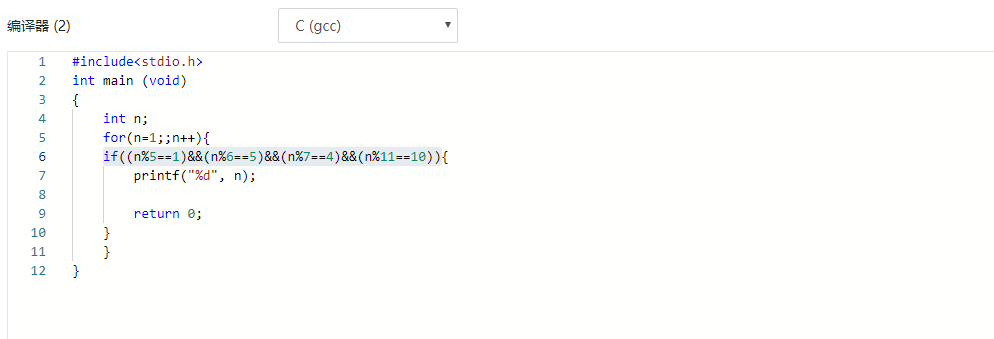数据处理:用了for循环语句和if语句---for(n=1;;n++),if((n%5==1)&&(n%6==5)&&(n%7==4)&&(n%11==10))