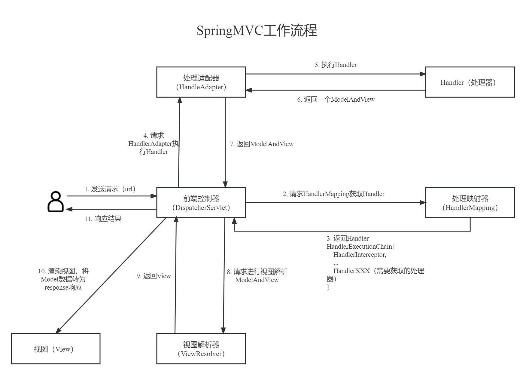 1、用户发送请求(url)至前端控制器DispatcherServlet;