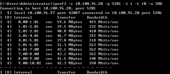 如果两台服务器是连通的情况下,在windows机器的终端上,用指令:iperf3 -c 10.100.96.20 -p 5201 -i 1 -t 10 -w 20K