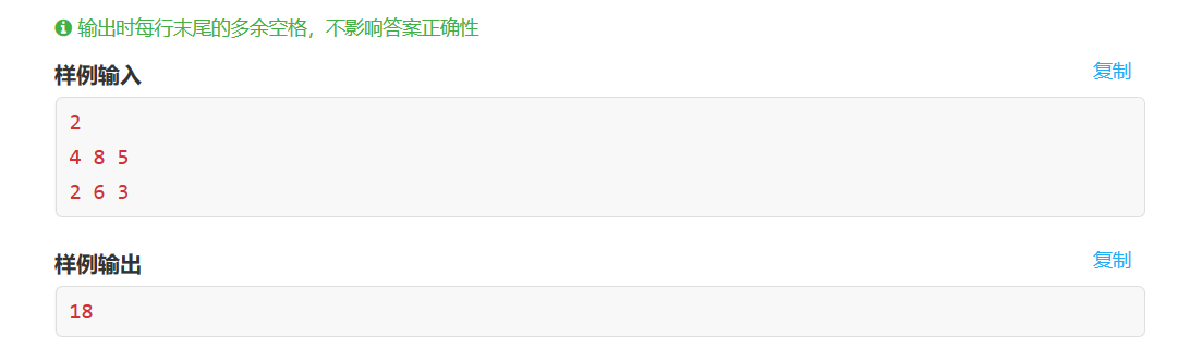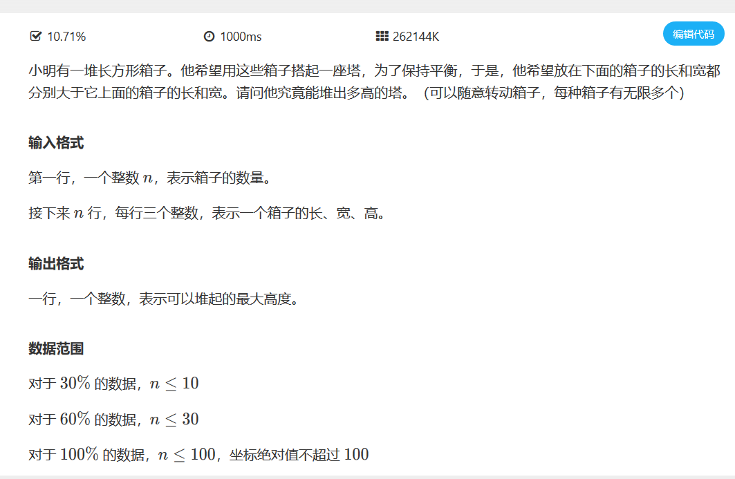 #include <bits/stdc++.h> #pragma GCC optimize(2) using namespace std; template < typename T > void read(T &x) { int f = 1;x = 0;char c = getchar(); for (;!isdigit(c);c = getchar()) if (c == '-') f = -f; for (; isdigit(c);c = getchar()) x = x * 10 + c - '0'; x *= f; } bool G[305][305]; struct node { int a, b, c; }a[305]; int vis[305]; int n; int dfs(int dep) { if(vis[dep]) return vis[dep]; bool flag = 1; int maxn = INT_MIN; for(int i = 1;i <= n;i++) if(G[dep][i] == 1) { flag = 0; maxn = max(maxn, dfs(i)); } if(flag == 1) { vis[dep] = a[dep].c; return a[dep].c; } vis[dep] = a[dep].c + maxn; return vis[dep]; } int main() { //freopen(".in", "r", stdin); //freopen(".out", "w", stdout); cin >> n; for(int i = 1;i <= n;i++) { read(a[i].a); read(a[i].b); read(a[i].c); } for(int i = 1;i <= n;i++) { a[n + i].c = a[i].a; a[n + i].b = a[i].c; a[n + i].a = a[i].b; a[2 * n + i].c = a[i].b; a[2 * n + i].b = a[i].c; a[2 * n + i].a = a[i].a; } n *= 3; for(int i = 1;i <= n;i++) for(int j = 1;j <= n;j++) if(min(a[i].a, a[i].b) > min(a[j].a, a[j].b) && max(a[i].a, a[i].b) > max(a[j].a, a[j].b)) G[i][j] = 1; int ans = INT_MIN; for(int i = 1;i <= n;i++) ans = max(ans, dfs(i)); cout << ans << endl; return 0; }