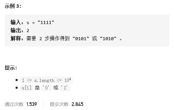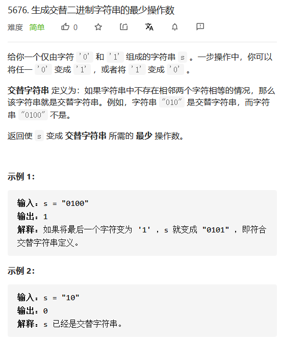 根据题意,符合题目要求的只有两种字符串:0101010…或1010101…,因此,我们可以直接构造这两种字符串并比较与原串的差异即可。