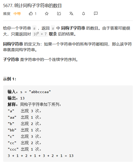 class Solution { public: long long countHomogenous(string s) { long long mod = 1e9 + 7; long long ans = 0, i = 0; int len = s.size(); while(i < len) { int begin = i; int end = begin; while(end < len && s[end] == s[begin]) end++; i = end; end--; long long num = end - begin + 1; long long t = (1 + num) * num / 2; ans += t; } return (ans % mod); } };