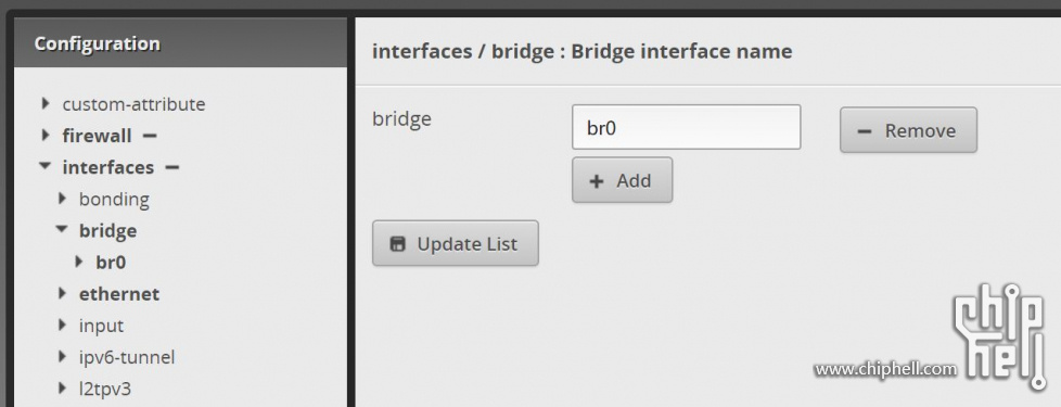 Config Tree ---- bridge ---- Add -----填写bridge名称(本例为br0)---- Preview