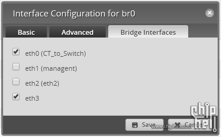 然后看到Bridge Interfaces标签,点开标签,将eth0和eth3加入这个br0