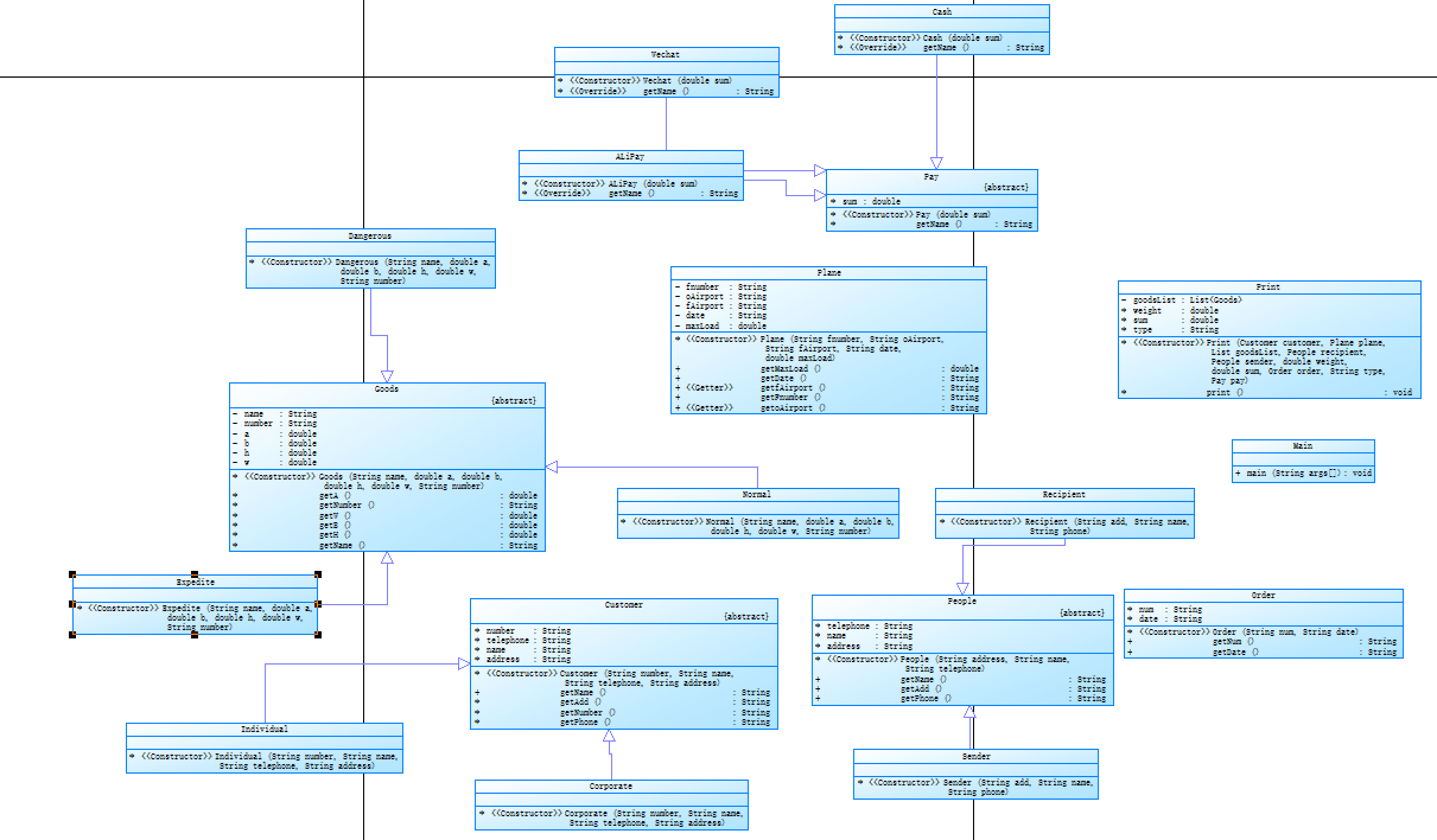 抽象类与接口的使用较为合理(如 Pay、Goods),支持一定的扩展性(如新增支付方式、客户类型)。