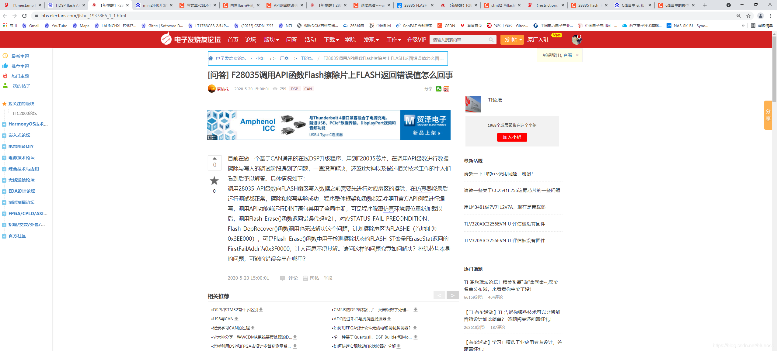 这次在28379d上用FLASH API库操作一个扇区,作为参数存储用的时候,发生一个现象:用仿真器连着,就能正常读写,摘除仿真器,用上位机软件通过CAN总线读写flash就擦除不成功。导致程序死掉,后台大while不运行,前台中断也不运行了。