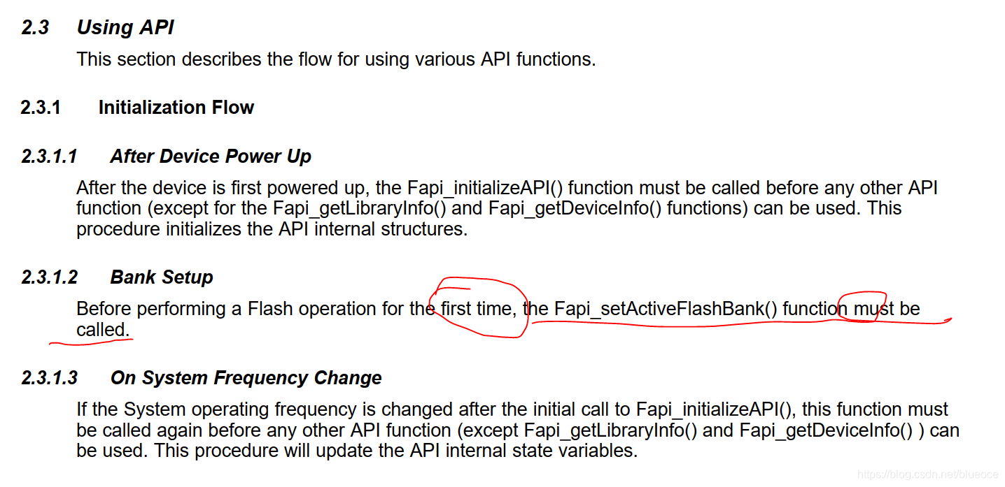 红色部分文档特别说明,实际上我在写读写flash的时候,开始应该是写了这个函数,后来修改过程中误删除了,没发现,导致出了问题,一时也怀疑不到这个点上去。