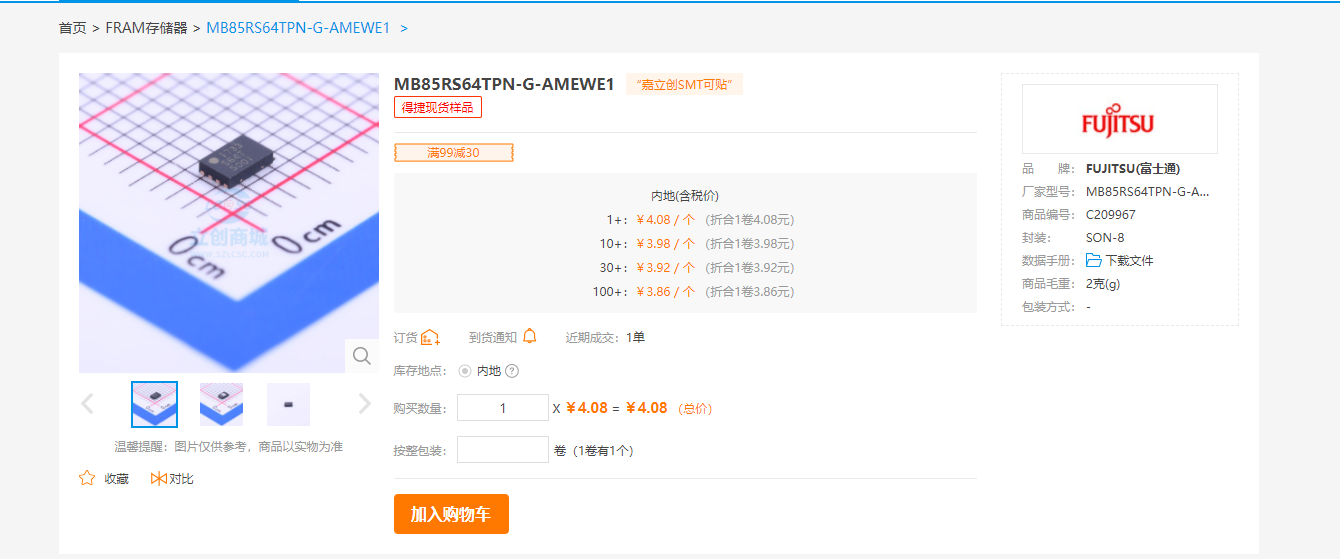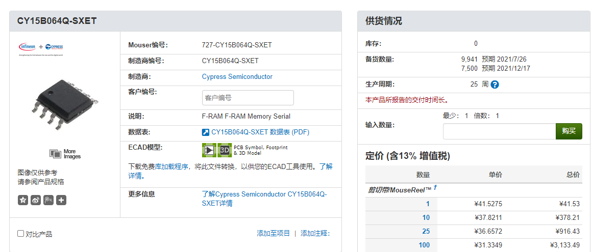 赛普拉斯铁电存储器CY15B064Q-SXET,