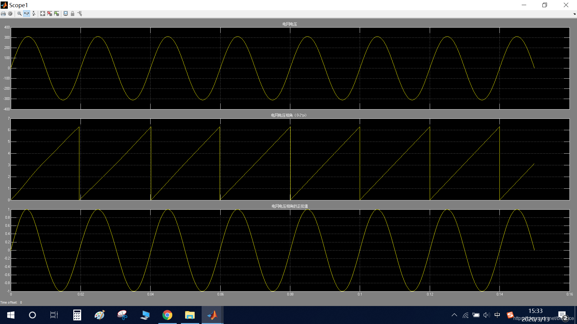 其中第一条曲线是电网电压,第二条曲线是锁相环输出的电网电压的电角度,每2*pi重复一次。三条曲线是根据锁定的电角度计算出来的正弦值。可以发现,第二条曲线和第一条曲线的相位是同步的,第一条曲线和第三条曲线是同相位的。
