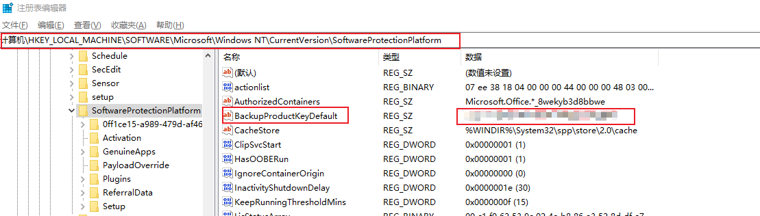 HKEY_LOCAL_MACHINE/ SOFTWARE / Microsoft / Windows NT / CurrentVersion / SoftwareProtectionPlatform,在右侧数值名称:BackupProductKeyDefault处双击就可以看到。