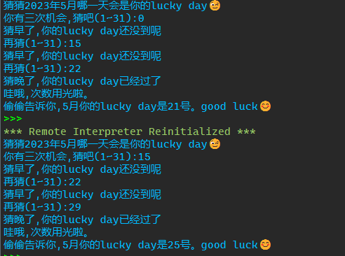 import random lucky_day=random.randint(1,31) print(f'猜猜2023年5月哪一天会是你的lucky day{chr(0x1f609)}') guess=int(input('你有三次机会,猜吧(1~31):')) flag=0 while lucky_day!=guess: if guess>lucky_day: print('猜晚了,你的lucky day已经过了') elif guess<lucky_day: print('猜早了,你的lucky day还没到呢') elif guess==lucky_day: break flag+=1 if flag==3: break guess=int(input('再猜(1~31):')) if flag<3: print(f'哇,猜中了{chr(0x1f923)}') elif flag==3: print(f'哇哦,次数用光啦。\n偷偷告诉你,5月你的lucky day是{lucky_day}号。good luck{chr(0x1f60a)}')