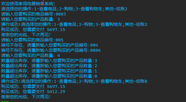 """ 家用电器销售系统 v1.3 """ #欢迎信息 print('欢迎使用家用电器销售系统!') #商品数据初始化 products = [ ['0001','电视机','海尔',5999.00,20], ['0002','冰箱','西门子',6998.00,15], ['0003','洗衣机','小天鹅',1999.00,10], ['0004','空调','格力',3900.00,10], ['0005','热水器','美的',688.00,30], ['0006','笔记本','联想',5699.00,10], ['0007','微波炉','苏泊尔',480.50,33], ['0008','投影仪','松下',1250.00,12], ['0009','吸尘器','飞利浦',999.00,9] ] #初始化用户购物车 products_cart = [] option = input('请选择您的操作;1-查看商品;2-购物;3—查看购物车;其他-结账') while option in['1', '2', '3']: if option == '1': # 产品信息列表 print('产品和价格信息如下:') print('{:*^48}'.format('*')) print('{:10}'.format('编号'), '{:10}'.format('名称'), '{:10}'.format('品牌'), '{:10}'.format('价格'), '{:10}'.format('库存数量')) print('{:-^50}'.format('-')) for i in range(len(products)): print('{:10}'.format(products[i][0]), '{:10}'.format(products[i][1]), '{:10}'.format(products[i][2]), '{:10}'.format(products[i][3]), '{:10}'.format(products[i][4])) print('{:-^50}'.format('-')) elif option == '2': product_id = input('请输入您要购买的产品编号:') while product_id not in [item[0] for item in products]: product_id = input('编号不存在,请重新输入您要购买的产品编号:') count = int(input('请输入您要购买的产品数量:')) while count > products[int(product_id)-1][4]: count = int(input('数量超出库存,请重新输入您要购买的产品数量:')) # 将所购买的商品加入购物车 if product_id not in [item[0] for item in products_cart]: products_cart.append([product_id,count]) else: for i in range(len(products_cart)): if products_cart[i][0] == product_id: products_cart[i][1]+=count # 更新商品列表 for i in range(len(products)): if products[i][0] == product_id: products[i][4] -= count else: print('购物车信息如下:') print('{:*^48}'.format('*')) print('{:10}'.format('编号'), '{:10}'.format('购买数量')) print('{:-^50}'.format('-')) for i in range(len(products_cart)): print('{:10}'.format(products_cart[i][0]), '{:6}'.format(products_cart[i][1])) print('{:-^50}'.format('-')) option = input('操作成功!请选择你的操作:1-查看商品;2-购物;3-查看购物车;其他-结账') # 计算金额 if len(products_cart) > 0: amount = 0 for i in range(len(products_cart)): product_index = 0 for j in range(len(products)): if products[j][0] == products_cart[i][0]: product_index = j break price = products[product_index][3] count = products_cart[i][1] amount += price*count if 5000 < amount <= 10000: amount = amount * 0.95 elif 10000 < amount <= 20000: amount = amount * 0.90 elif amount > 20000: amount = amount*0.85 else: amount = amount*1 print('购买成功,您需要支付%8.2f元' % amount) # 退出系统 print('谢谢您的光临,下次再见!')