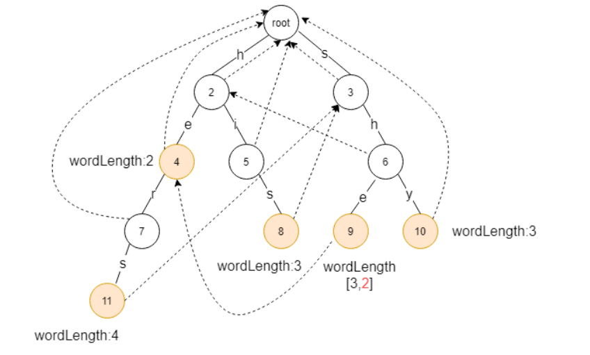 假设有模式串 he、she、hers、his、shy,则其字典树构建结果如下。