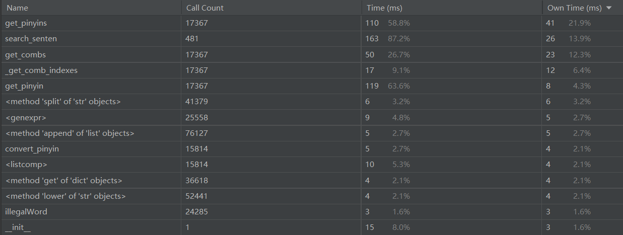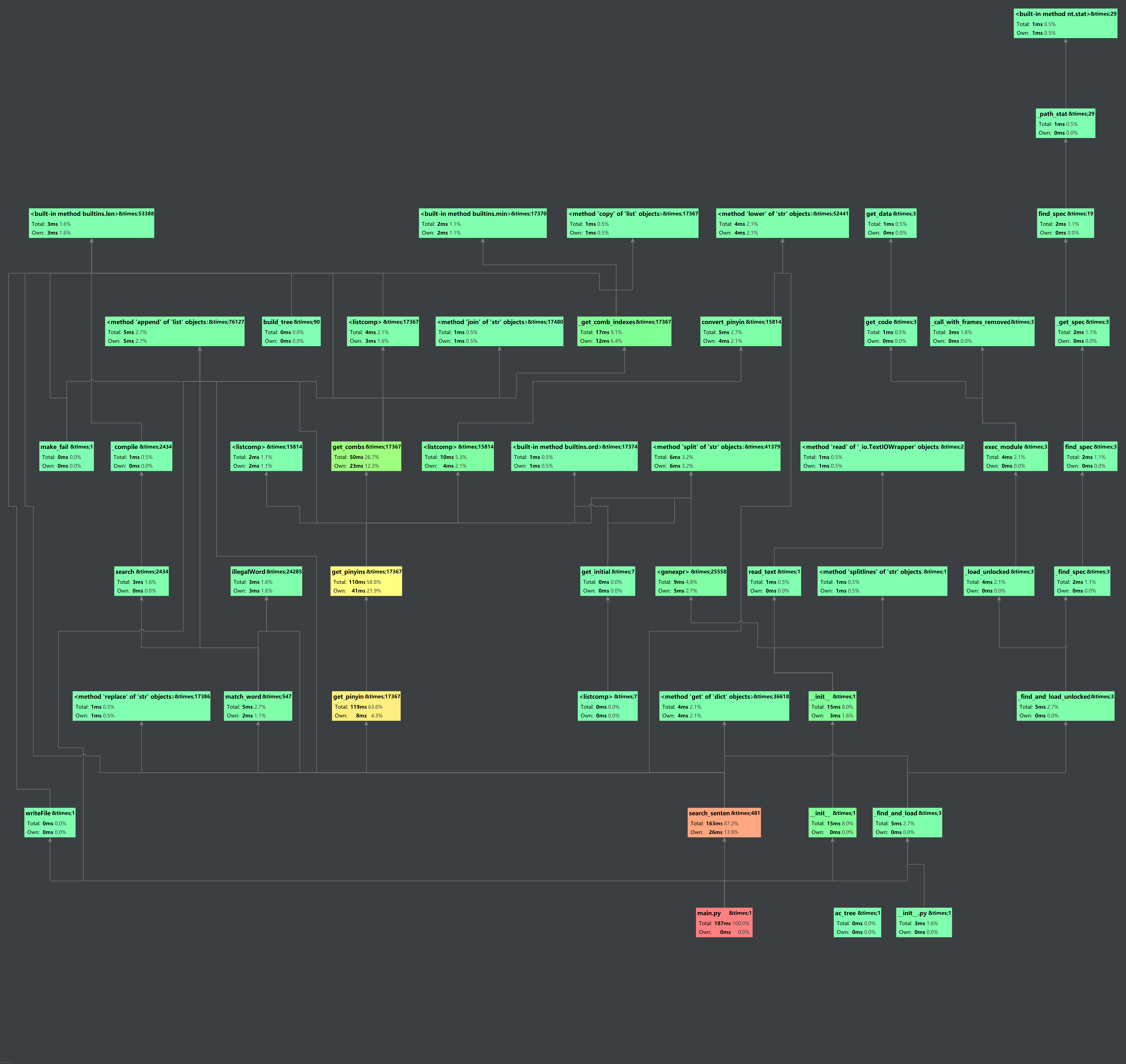 你程序中消耗最大的函数get_pinyins和search_senten。其中get_pinyins为调用的pypinyin库中的函数,汉字转换拼音需要消耗时间,无法优化。对于查找匹配函数search_senten,采取优化方式,ac自动机中采用fail指针进行优化。