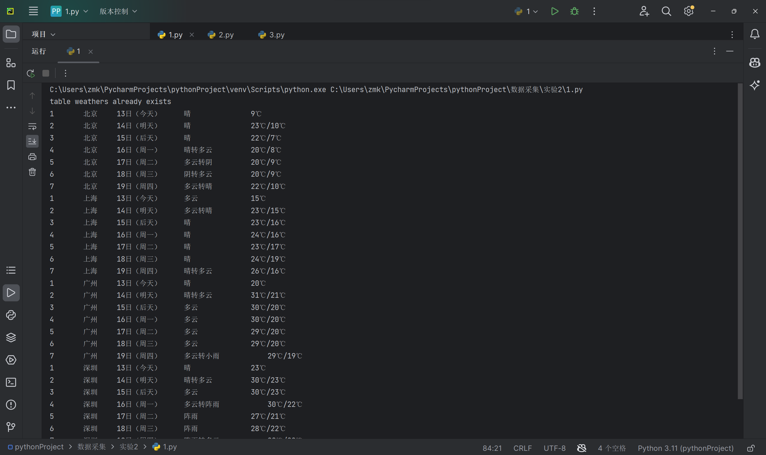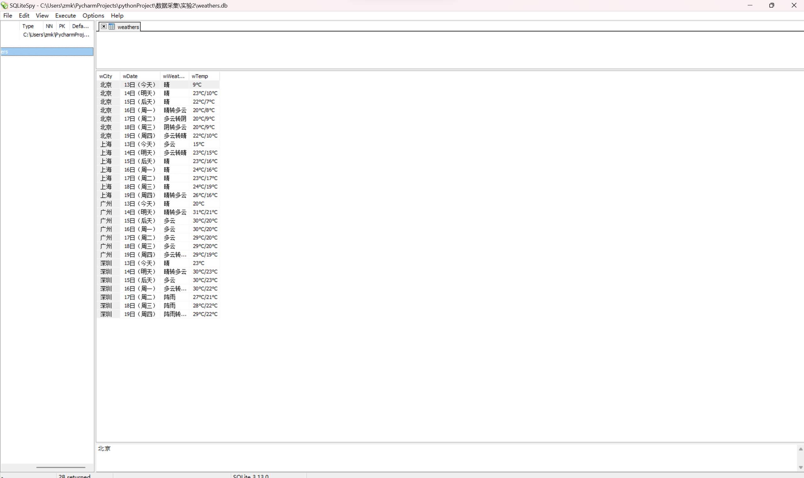 * 要求:在中国气象网(http://www.weather.com.cn)给定城市集的7日天气预报,并保存在数据库。代码