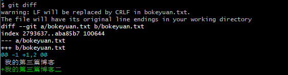 #新建一个txt文件 touch bokeyuan.txt #添加内容:我的第三篇博客 #将文件添加到仓库 git add bokeyuan.txt #提交文件 git commit -m '第一次提交'