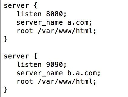 但我们一般访问应用的时候都是希望不加端口就访问域名,也即两个应用都通过 80 端口访问。但我们知道服务器上的一个端口只能被一个程序使用,这时候如何该怎么办呢?一个常用的方法是用 Nginx 进行端口转发。Nginx 的实现原理是:用 Nginx 监听 80 端口,当有 HTTP 请求到来时,将 HTTP 请求的 HOST 等信息与其配置文件进行匹配并转发给对应的应用。例如当用户访问 book.douban.com 时,Nginx 从配置文件中知道这个是图书应用的 HTTP 请求,于是将此请求转发给 8001 端口的应用处理。当用户访问 movie.douban.com 时,Nginx 从配置文件中知道这个是电影应用的 HTTP 请求,于是将此请求转发给 8002 端口的应用处理。一个简单的 Nginx 配置文件(部分)如下面所示: