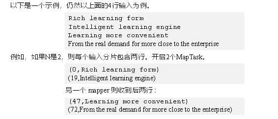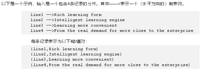 没一行均为一条记录,被分隔符分割为key、value,可以通过在驱动类中设置conf.set(KeyValueLineRecordReader.KEY_VALUE_SEPERATOR,"\t"),来设定分隔符。默认分隔符是tab(\t)。