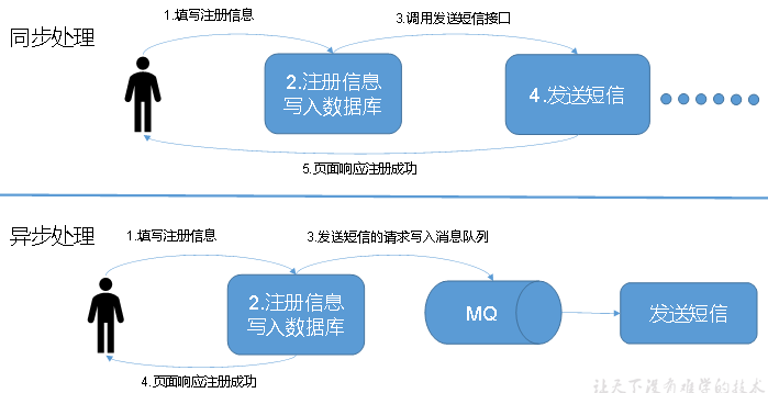 消息生产者生产消息发送到Queue中,然后消息消费者从Queue中取出并且消费消息。