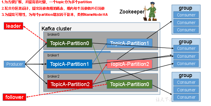 8)leader:每个分区多个副本的“主”,生产者发送数据的对象,以及消费者消费数据的对象都是leader。