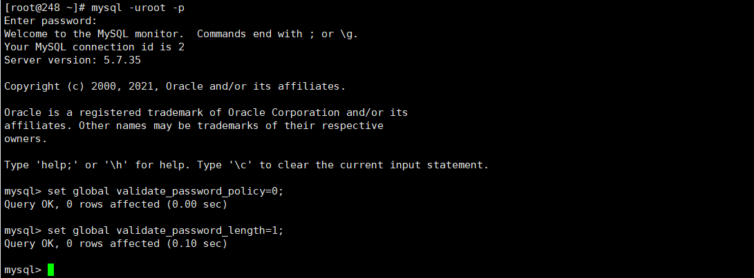 mysql> set global validate_password_length=1;