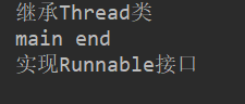 class MyThread extends Thread{ @Override public void run() { System.out.println("继承Thread类"); } } class MyRunnable implements Runnable{ @Override public void run() { System.out.println("实现Runnable接口"); } } public class Test{ public static void main(String[] args) { MyThread myThread=new MyThread(); myThread.start(); Thread thread=new Thread(new MyRunnable()); thread.start(); System.out.println("main end"); } }