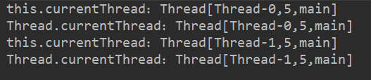 class MyThread extends Thread{ @Override public void run() { System.out.println("this.currentThread:"+this.currentThread()); System.out.println("Thread.currentThread:"+Thread.currentThread()); } } public class Test{ public static void main(String[] args) { MyThread myThread=new MyThread(); Thread thread=new Thread(myThread); thread.start(); myThread.start(); } }