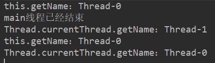 class MyThread extends Thread{ @Override public void run() { try { Thread.sleep(1000); System.out.println("this.getName:"+this.getName()); System.out.println("Thread.currentThread.getName:"+Thread.currentThread().getName()); } catch (InterruptedException e) { e.printStackTrace(); } } } public class Test{ public static void main(String[] args) throws InterruptedException { MyThread myThread=new MyThread(); Thread thread=new Thread(myThread); thread.start(); Thread.sleep(1000); myThread.start(); System.out.println("main线程已经结束"); } }