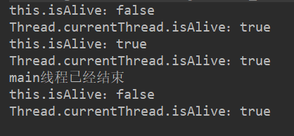 class MyThread extends Thread{ @Override public void run() { try { Thread.sleep(1000); System.out.println("this.isAlive:"+this.isAlive()); System.out.println("Thread.currentThread.isAlive:"+Thread.currentThread().isAlive()); } catch (InterruptedException e) { e.printStackTrace(); } } } public class Test{ public static void main(String[] args) throws InterruptedException { MyThread myThread=new MyThread(); myThread.run(); Thread.sleep(1000); myThread.start(); Thread.sleep(1000); Thread thread=new Thread(myThread); thread.start(); System.out.println("main线程已经结束"); } }